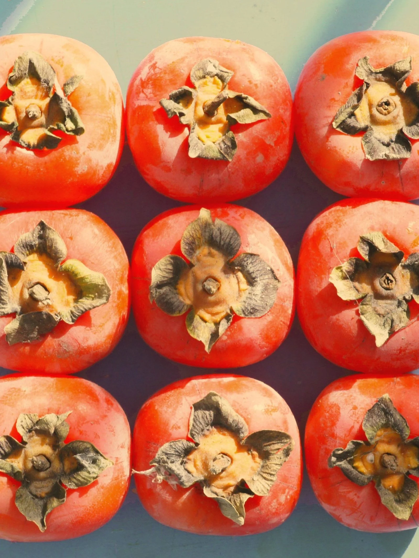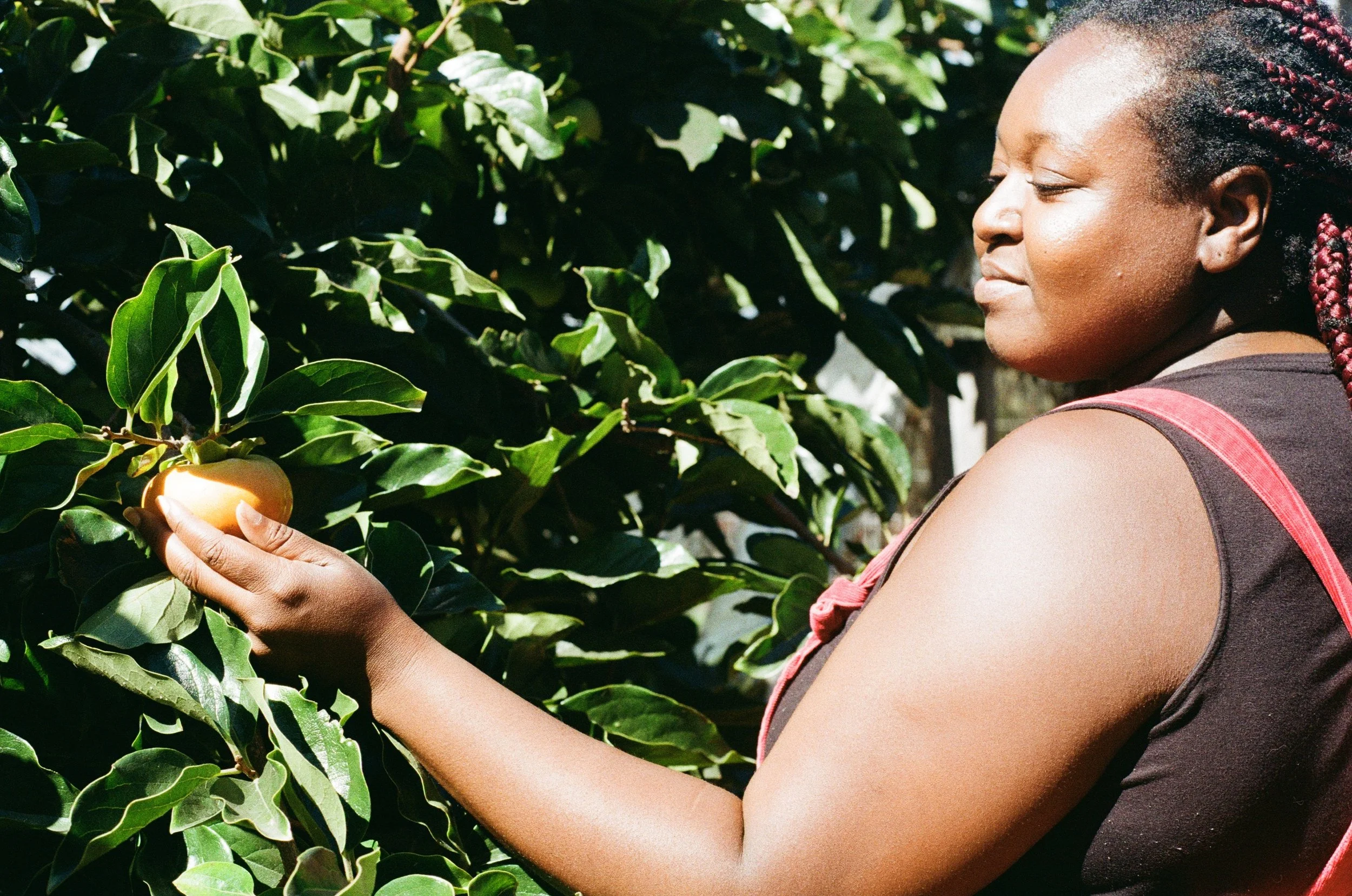 Image of Sanura gazing softly at the persimmon she is gently grasping in her left hand