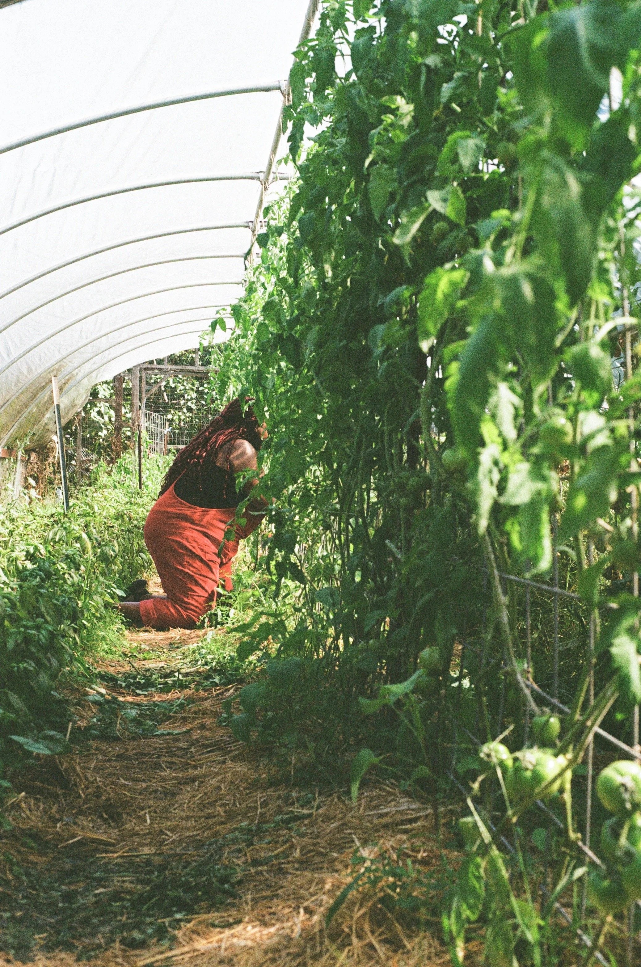 Picture of Sanura working on her knees as she tends to the tomato vines in the hoop house